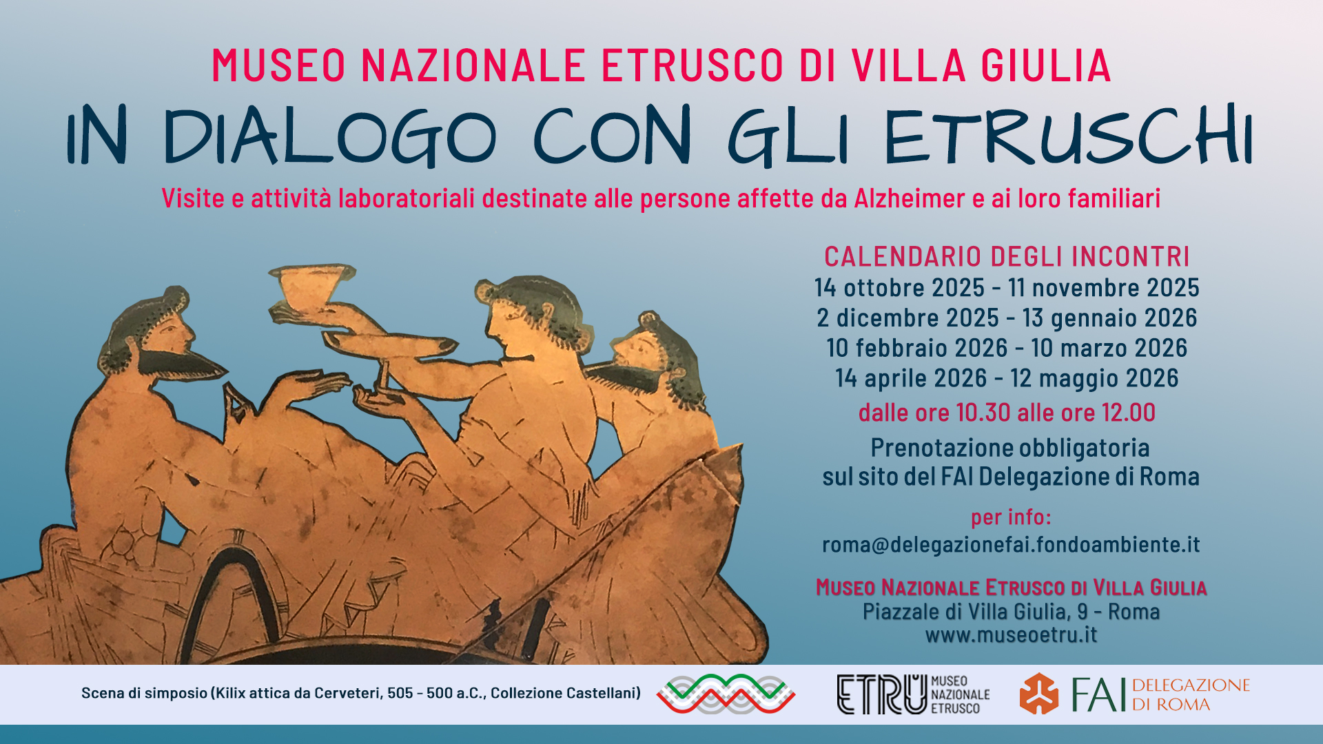 Un nuovo appuntamento con il progetto IN DIALOGO CON GLI ETRUSCHI, un ciclo di incontri di welfare culturale nato dalla collaborazione del Museo Nazionale Etrusco di Villa Giulia con il FAI - Delegazione di Roma dedicato alle persone con l'Alzheimer e a chi sta loro accanto.