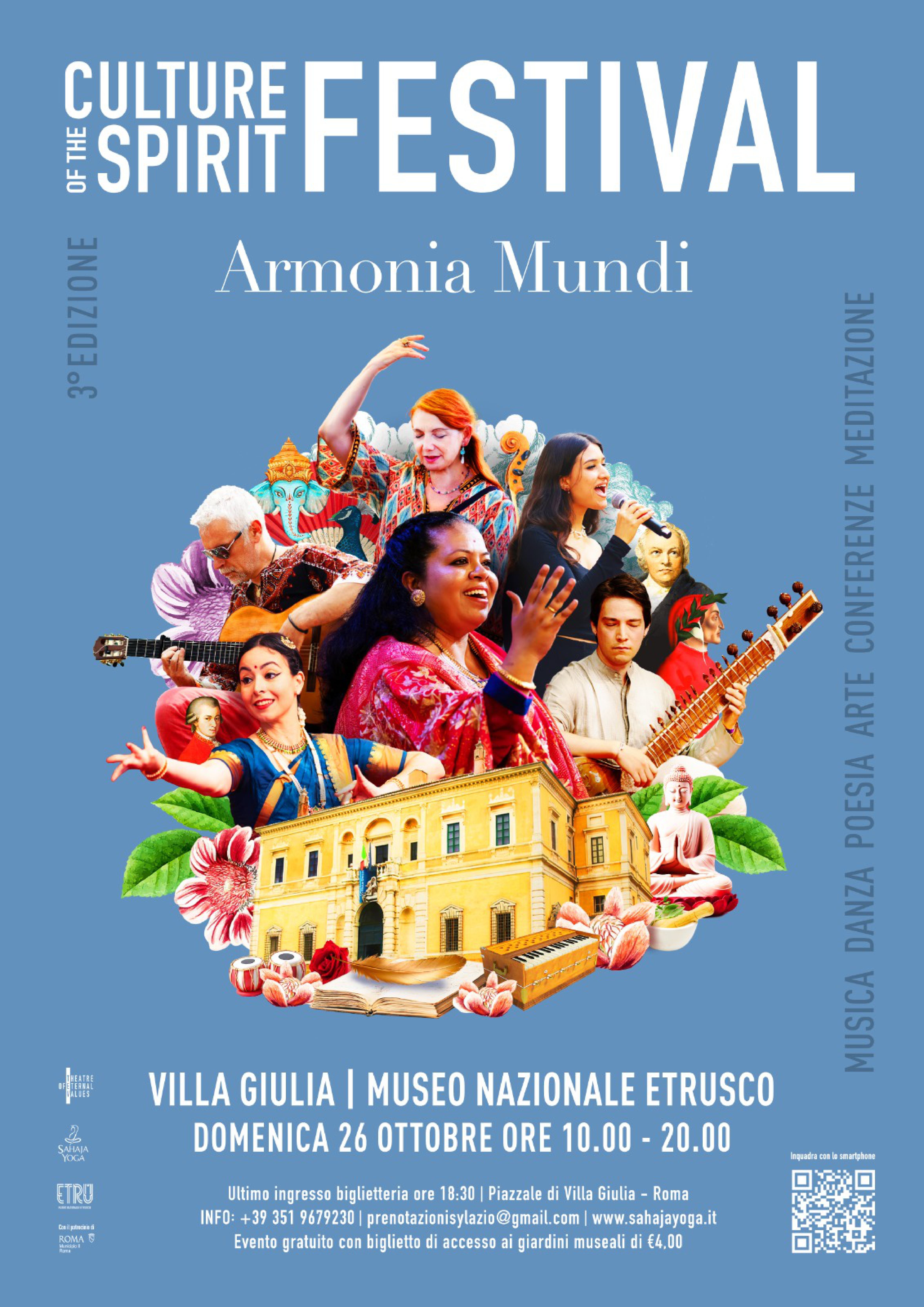 Domenica 26 ottobre, dalle 10 alle 20 (ultimo ingresso ore 19.00), Il Culture of the Spirit Festival torna a Roma con la sua terza edizione, “Armonia Mundi”, in collaborazione con il Museo Nazionale Etrusco di Villa Giulia, utilizzando gli straordinari spazi della villa,  in un dialogo vivo tra passato e presente.