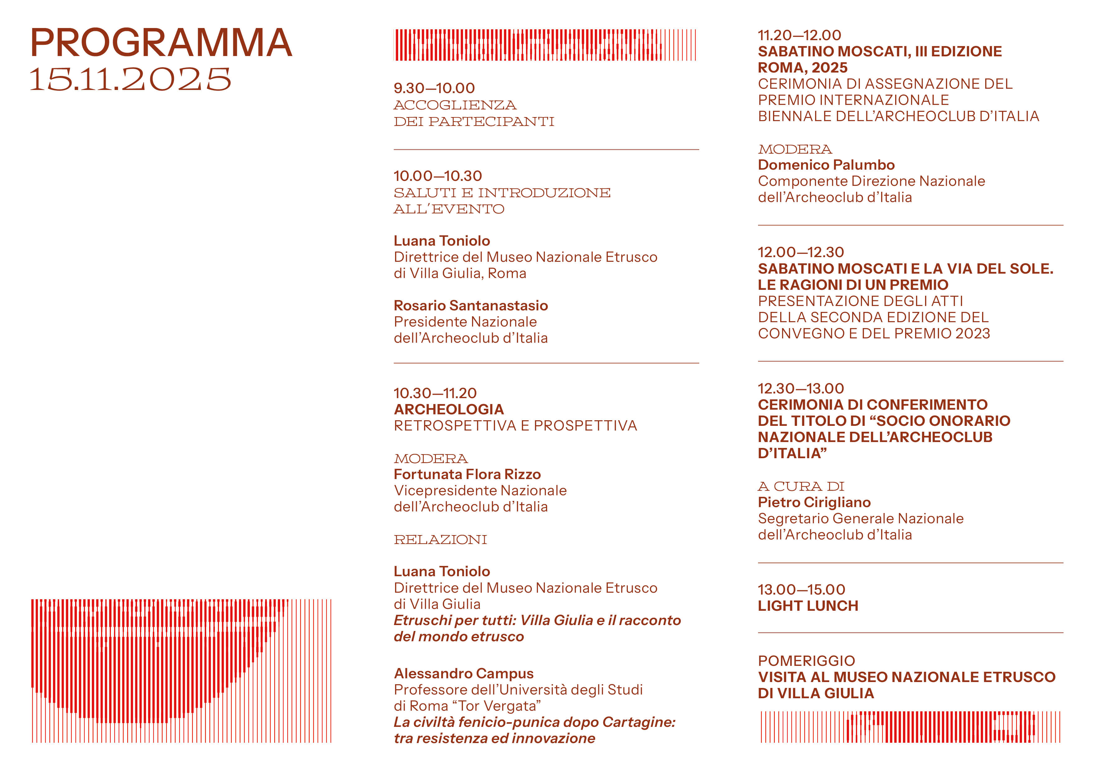 Il Museo Nazionale Etrusco di Villa Giulia è lieto di ospitare Sabato 15 Novembre 2025 II premio Internazionale Sabatino Moscati a cura dell'Archeoclub d'Italia (organizzazione a cura della Segreteria Generale e del Dipartimento Scuola, Cultura e Progetti Speciali).